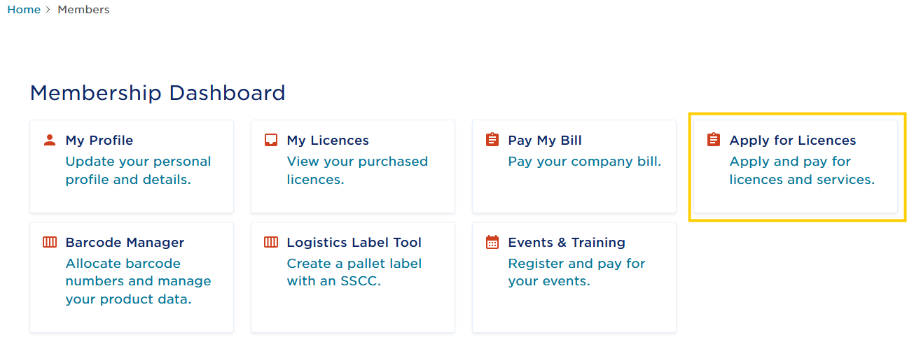 • Once logged in, click on Apply for Licences as shown below. If you don't see this screen when you login, you can find Apply for Licences by clicking on your name at the top of the page and then My Dashboard in the dropdown.