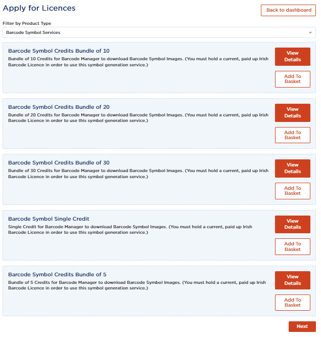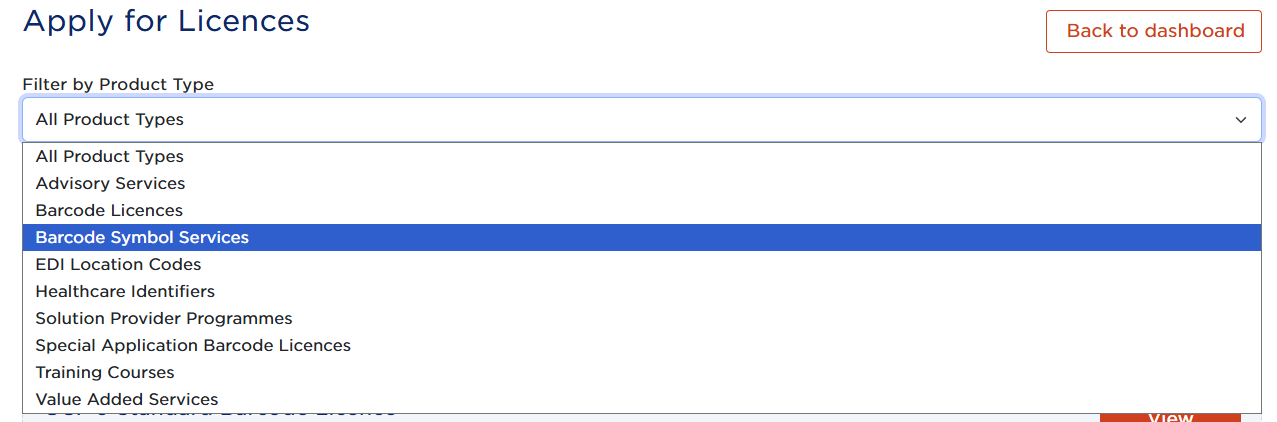 - Click the dropdown under Filter by Product Type and select Barcode Symbol Services